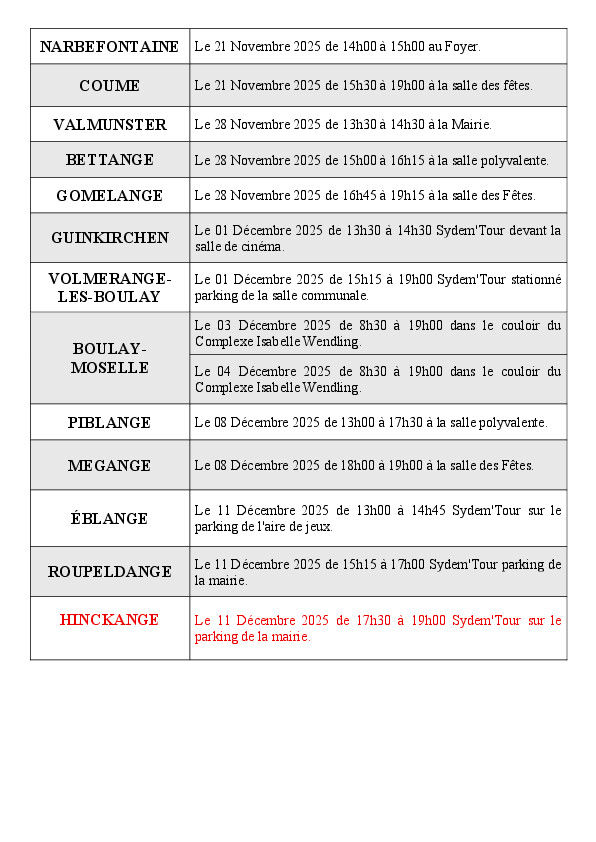 Pour les personnes souhaitant faire un don de leur plasma, une navette gratuite est organisée par l’Amicale des donneurs de sang bénévoles de Falck, Hargarten et Dalem en partenariat avec la Communauté de Communes de la Houve et du Pays Boulageois pour se rendre à la maison du don à Metz :