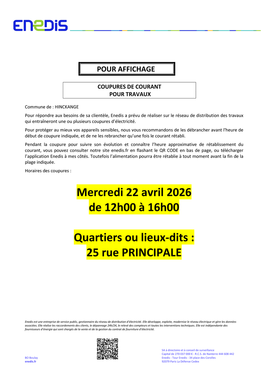 ENEDIS vous informe qu'une coupure de courant pour travaux aura lieu le