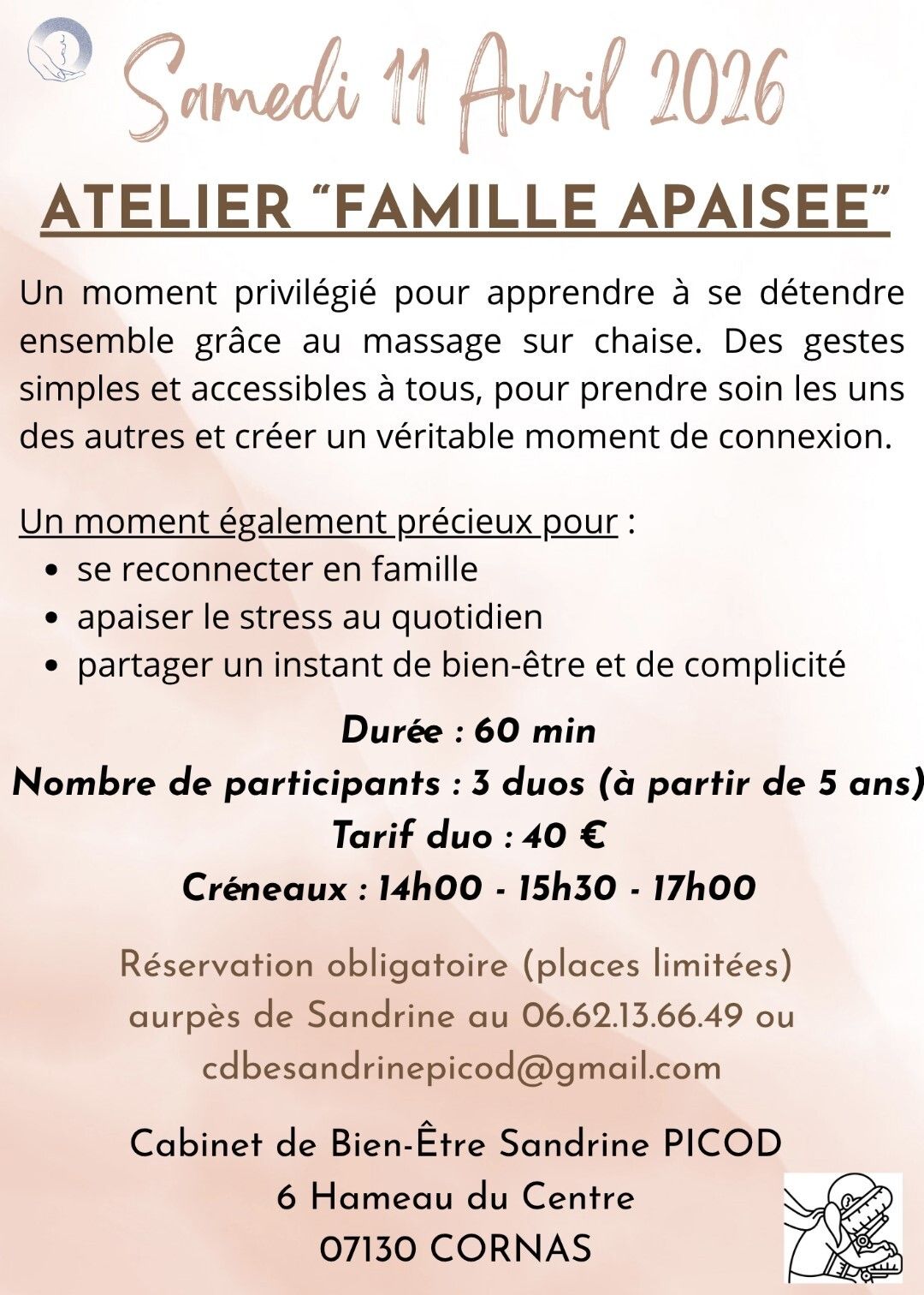 Le Cabinet Bien-Être de Cornas vous propose un moment privilégié pour apprendre à se détendre ensemble grâce au massage sur chaise. Des gestes simples, accessibles à tous, pour prendre soin les uns des autres et créer un véritable moment de connexion.