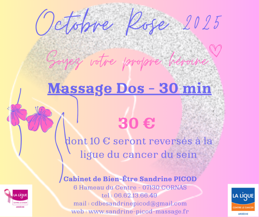 Octobre Rose, c'est le mois de la sensibilisation au cancer du sein. Un mois pour rappeler l'importance du dépistage, mais aussi l'importance de prendre soin de soi. C"est pourquoi, je vous propose un massage du dos tout en douceur, pour relâcher les tensions et vous accorder un moment rien qu'à vous. Parce qu'écouter son corps et lui offrir de la bienveillance fait partie du chemin vers la santé. Offre disponible tout le mois d'octobre 2025. Sandrine.