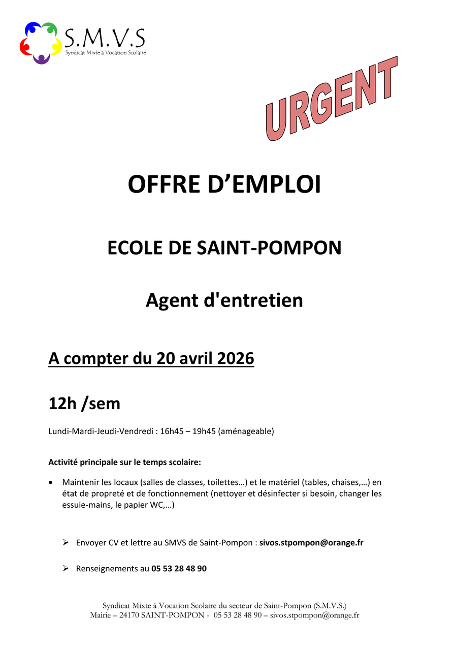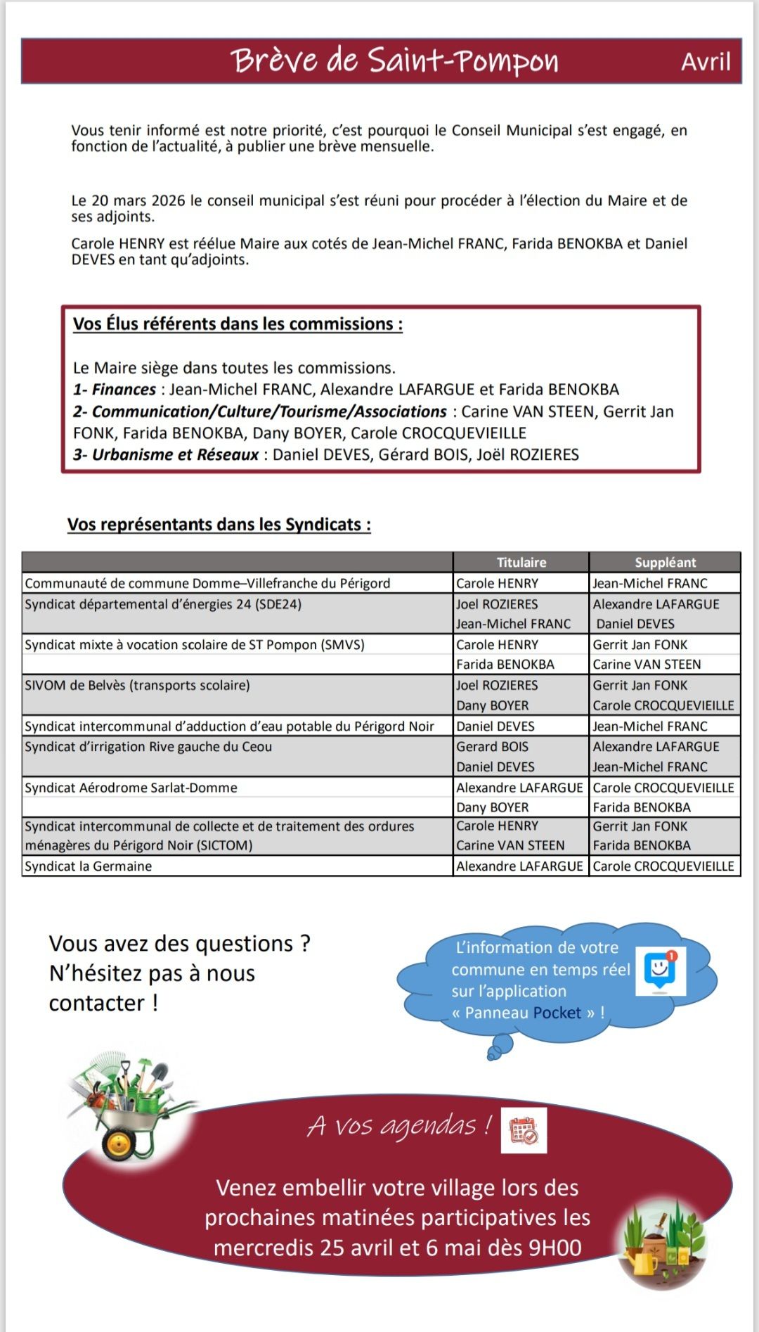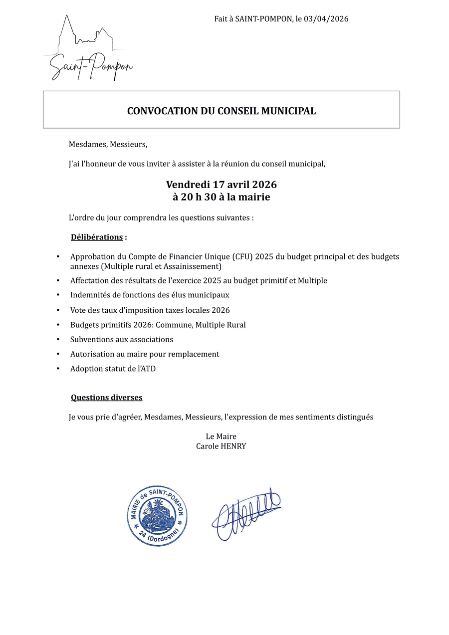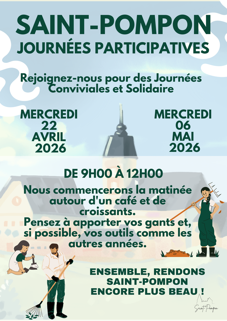 Pour plus d’informations, merci de contacter la mairie de Saint-Pompon 0553284890 le matin ou par mail mairie.stpompon@orange.fr