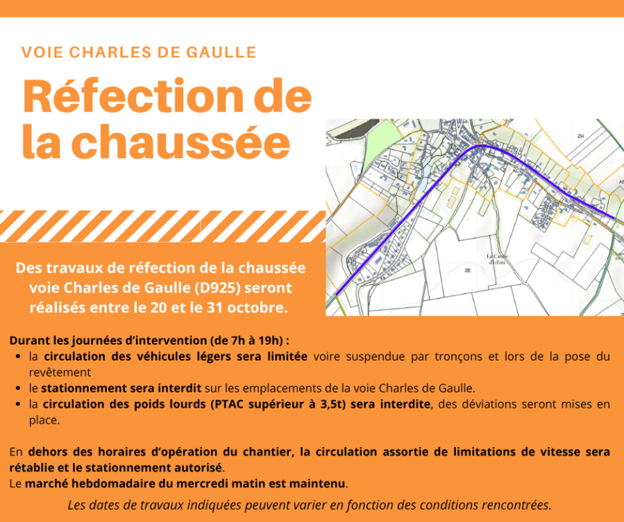 🚧 Des travaux de réfection de la chaussée voie Charles de Gaulle (D925) seront réalisés entre le 20 et le 31 octobre, sous la maîtrise d’ouvrage de la direction des routes 76.