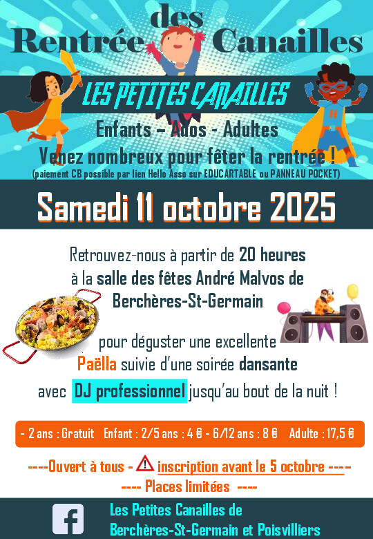 Pour une inscription plus rapide et un paiement par CB : https://www.helloasso.com/associations/association-des-petites-canailles-de-bercheres-st-germain-et-poisvilliers/evenements/la-rentree-des-canailles-samedi-11-octobre-2025