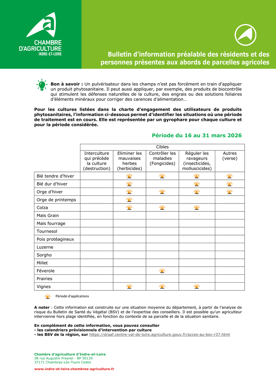 En application de l'arrêté du 29 avril 2024 approuvant la charte d'engagements des utilisateurs agricoles de produits phytopharmaceutiques pour le département d'Indre-et-Loire, nous vous adressons le bulletin d'information préalable couvrant la période du 16 au 31 mars 2026