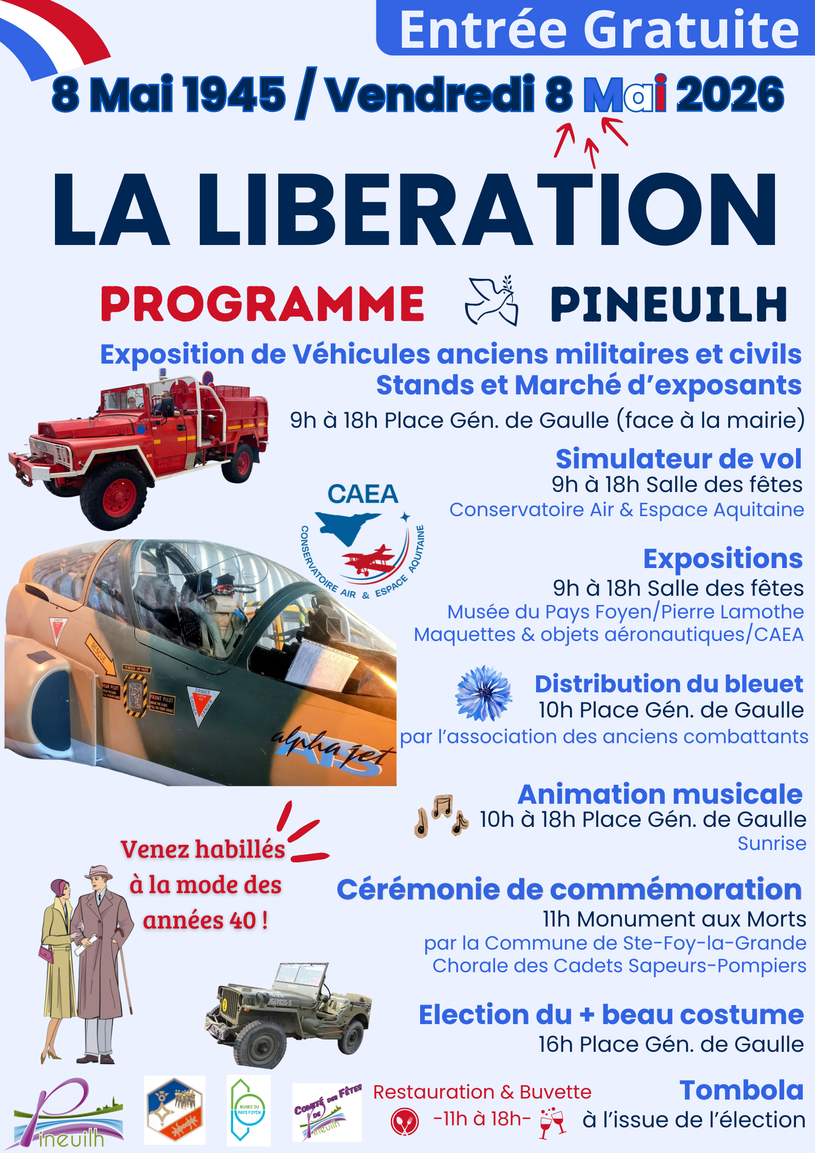 Au Programme : des animations musicales, des expositions, une impressionnante collection de véhicules anciens civils et militaires, ainsi que des véhicules de pompiers. Ne manquez pas la distribution du bleuet, symbole de mémoire et de solidarité, et surtout, vivez une expérience unique grâce à 3 simulateurs de vol du Conservatoire Air et Espace Aquitaine!