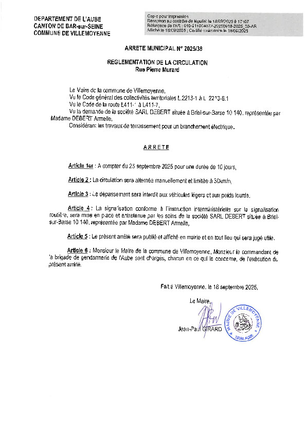 La circulation sera réglementée à compter du jeudi 25 septembre 2025 dans la rue Pierre Murard au vu de travaux de terrassement pour un branchement électrique.