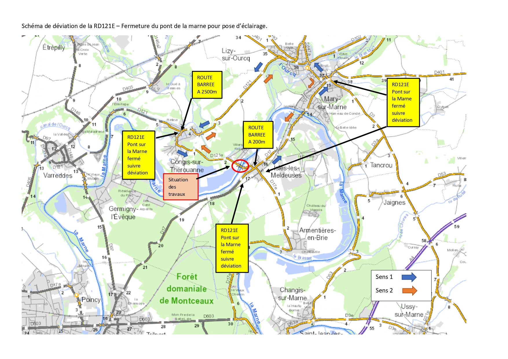 La circulation sera interdite le mercredi 3 décembre de 8h30 à 18h afin que les services du Département puissent réaliser des travaux d'éclairages sur le pont entre Isles les Meldeuses et Congis.