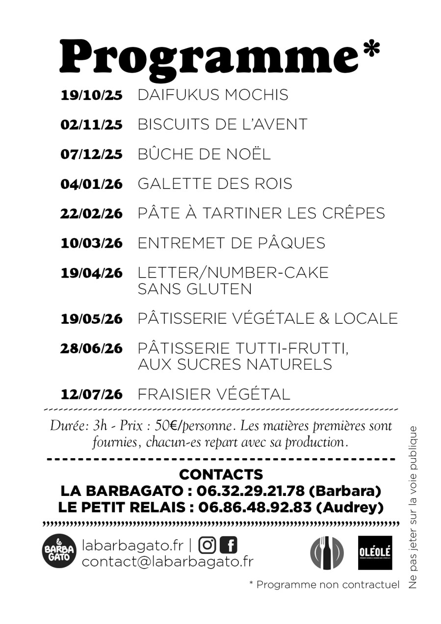 Au programme des ateliers des prochains mois : des recettes de pâtisseries traditionnelles japonaises appelées Daifukus Mochis (dimanche 19 octobre), de biscuits pour remplir le calendrier de l’Avent (dimanche 2 novembre), de bûche pour les fêtes de Noël (dimanche 7 décembre) ou encore de galette des rois pour lancer la nouvelle année (dimanche 4 janvier). Les inscriptions se font auprès de l’association Olé Olé qui contribue à créer des évènements autour de l'alimentation et de la culture.