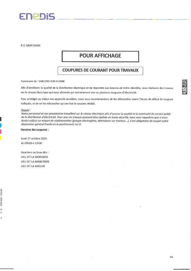 ⚠️🔌💡Coupure de courant par ENEDIS à Coulonges les Sablons pour travaux le lundi 27 octobre 2025 entre 09h00 et 12h00. Retrouvez les hameaux concernés ci-dessous 👇