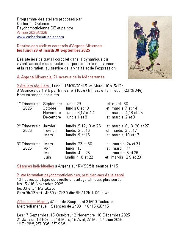 Ateliers de travail corporel et ateliers de dessin/ peinture animés par Catherine Oulanier, psychomotricienne et peintre