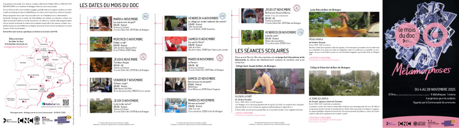 vous trouverez en pièce-jointe tout le programme du Mois du film documentaire édition 2025, temps fort culturel porté par Bretagne porte de Loire Communauté, à retrouver dans les bibliothèques, les salles communales, au cinéma Le Scénario et dans les collèges et lycées !