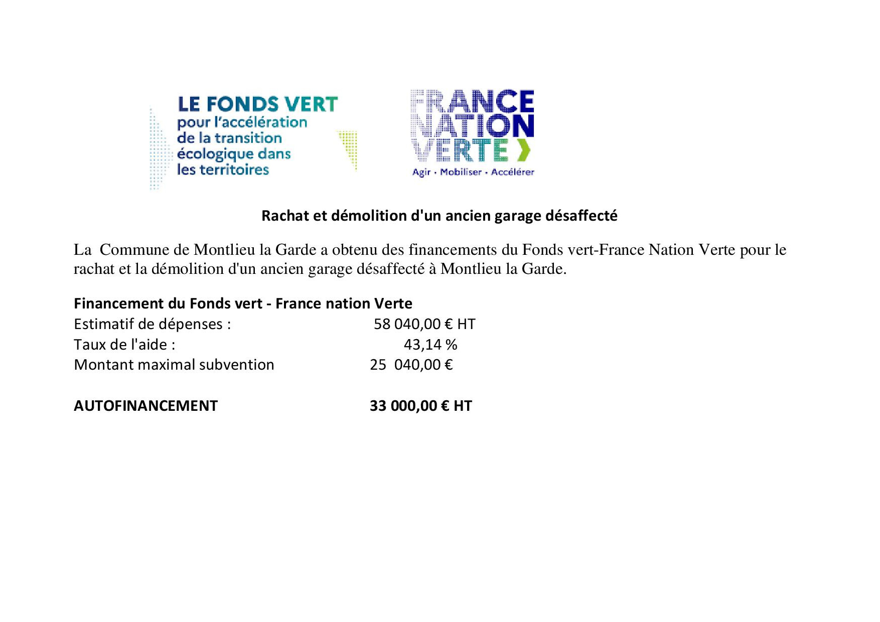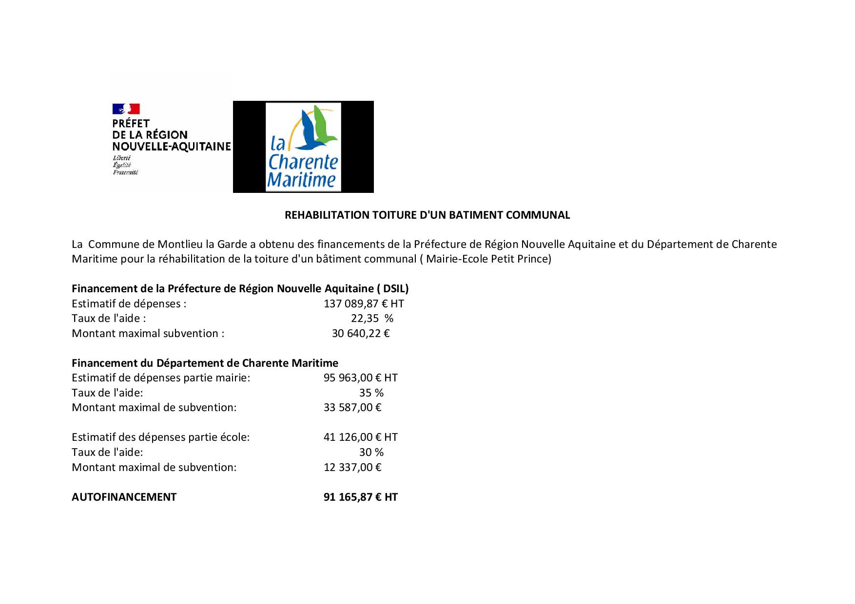 Ces travaux ont fait l'objet de demandes de financement auprès de la Région Nouvelle Aquitaine et de l'Union Européenne dont vous trouverez le détail ci dessous.