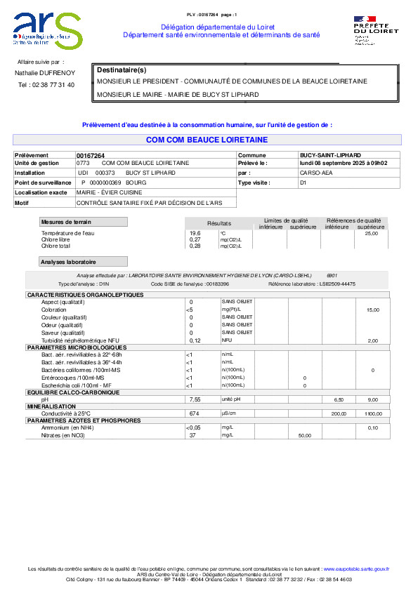 Veuillez trouver ci-joint les résultats des analyses d'eau effectuées dans le cadre du contrôle sanitaire assuré par l'agence régionale de santé pour la Préfète.