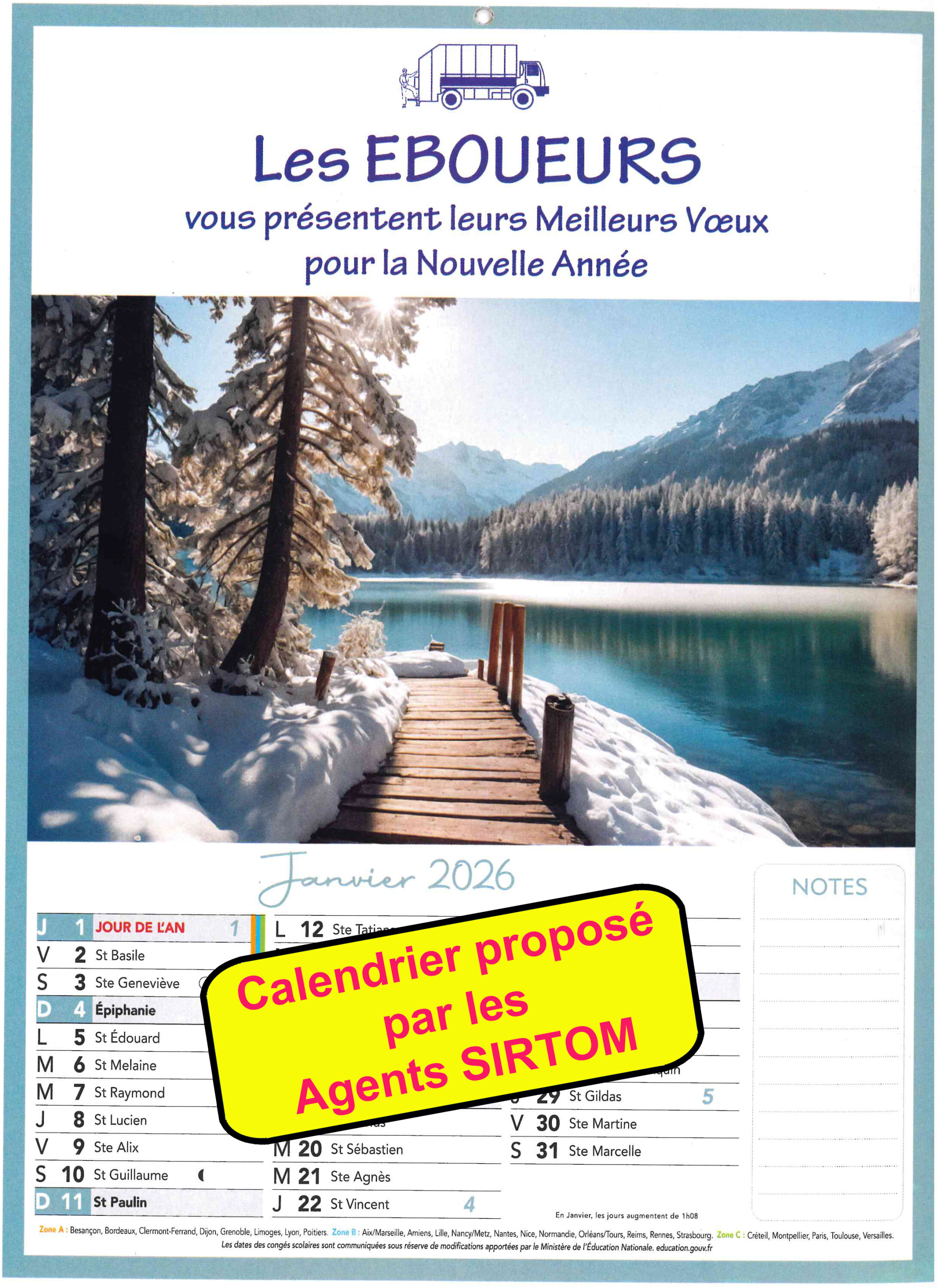 non identifié au logo du SIRTOM, intitulé « Les EBOUEURS vous présentent leurs Meilleurs Vœux pour la Nouvelle Année » avec un paysage enneigé.
