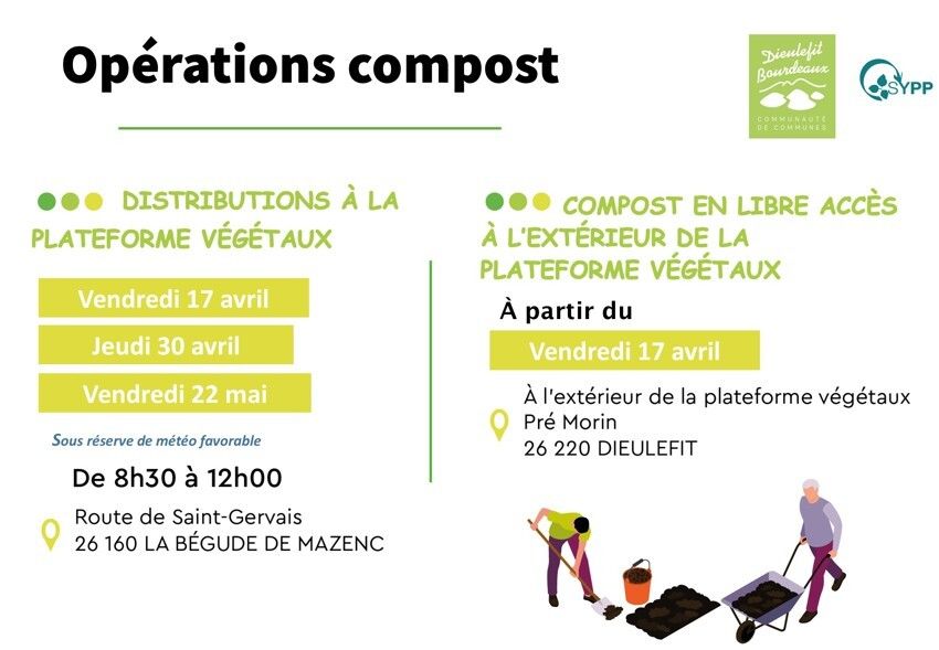A partir du vendredi 17 avril 2026 sera mis à disposition (en libre-service), à l’extérieur de la plateforme de végétaux de Dieulefit (en face de Super U) : Compost mûr (10 mois)