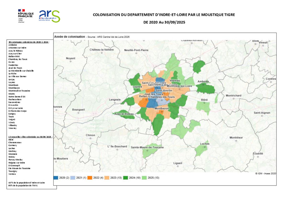 En 2025, la présence d’œufs de moustique tigre a été confirmée dans plusieurs communes d’Indre-et-Loire. Depuis le début de l’année, 13 nouvelles communes ont été déclarées colonisées, portant à 43 le nombre total de communes concernées au 30 septembre 2025.