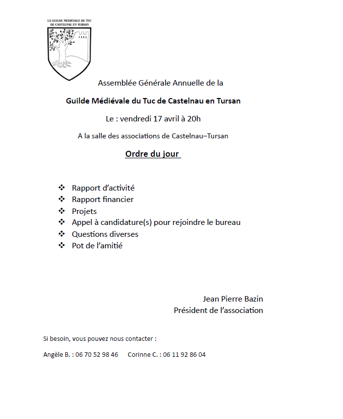 L'assemblĂ©e gĂ©nĂ©rale de la GUILDE MĂDIĂVALE DU TUC DE CASTELNAU-TURSAN aura lieu