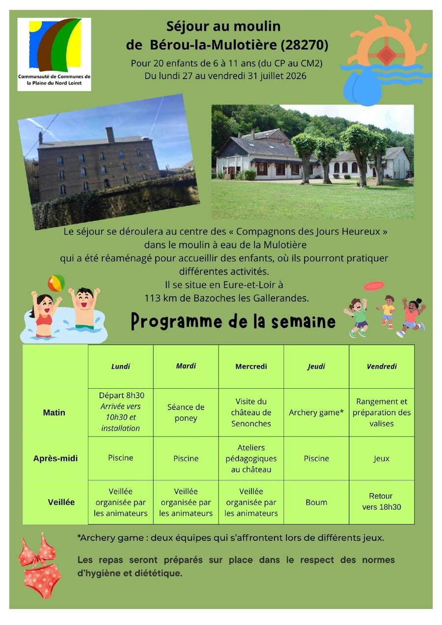 La Communauté de Communes de la Plaine du Nord Loiret invite vos petits 👧👦 aventuriers à un séjour exceptionnel au Moulin de Bérou-la-Mulotière cet été 🌞 !