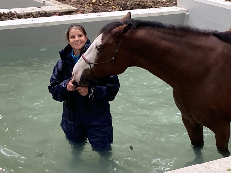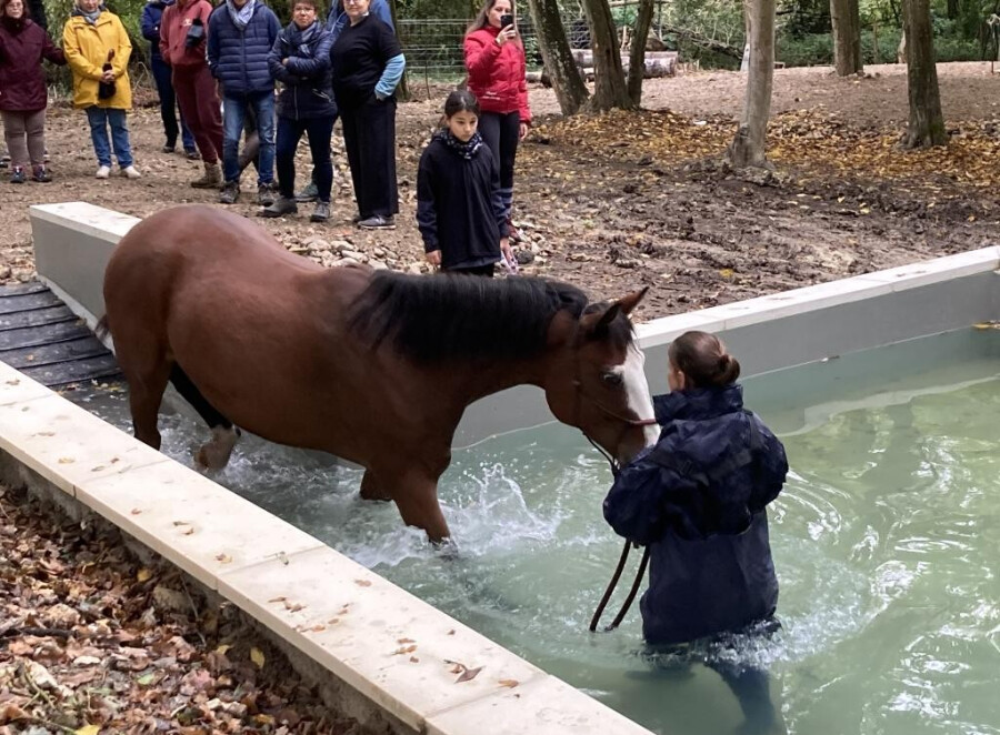 Un grand merci à Julie VROMAN pour son accueil chaleureux, sa démonstration du travail en bassin, ses explications avisées, et surtout le partage d'une passion qui exprime tant d'amour pour les chevaux. Toutes nos félicitations au cheval Dalco qui a manifesté allègrement devant un public ravi et ému son entière satisfaction à jouer avec l'eau du bassin !