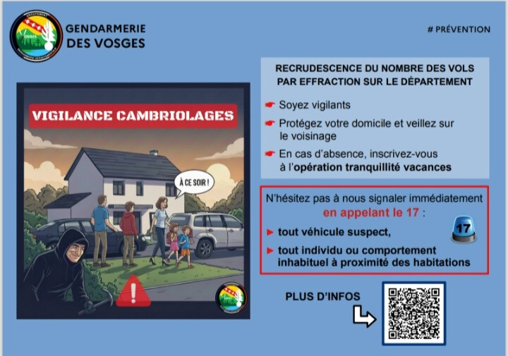 Suite à cambriolage d'une maison dans notre commun ce week-end. Soyez vigilant face à la recrudescence de vols actuellement sur le département