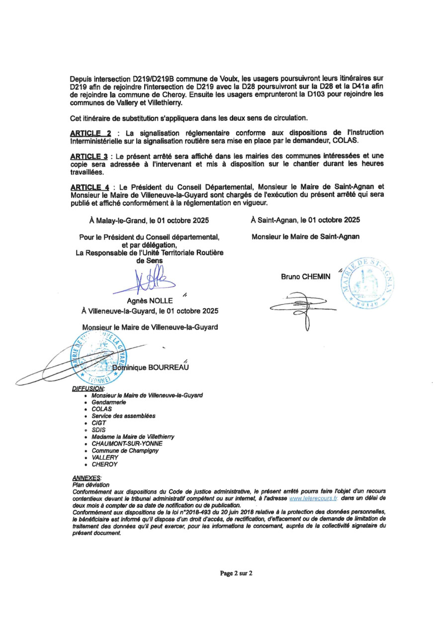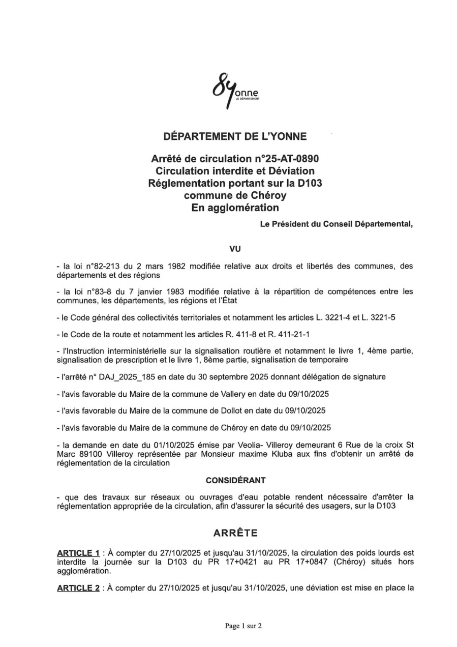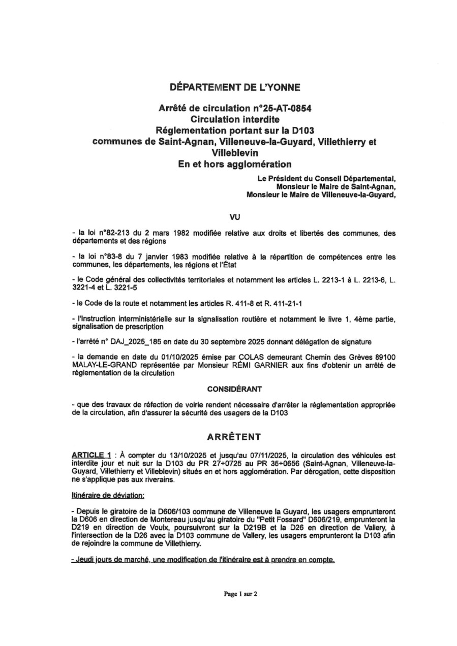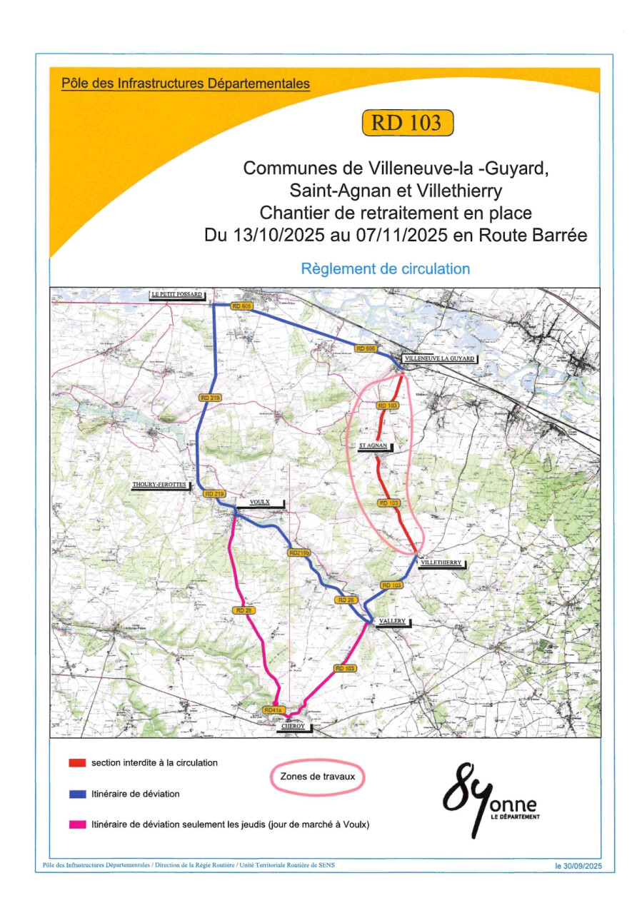 Le Département de l'Yonne engage des travaux de renforcement de structure de chaussée sur la Route Départementale 103 depuis la sortie du hameau « Les Badins », commune de Villethierry, jusqu’à l’entrée du giratoire (RD 606 - RD 103) à Villeneuve-la-Guyard.
