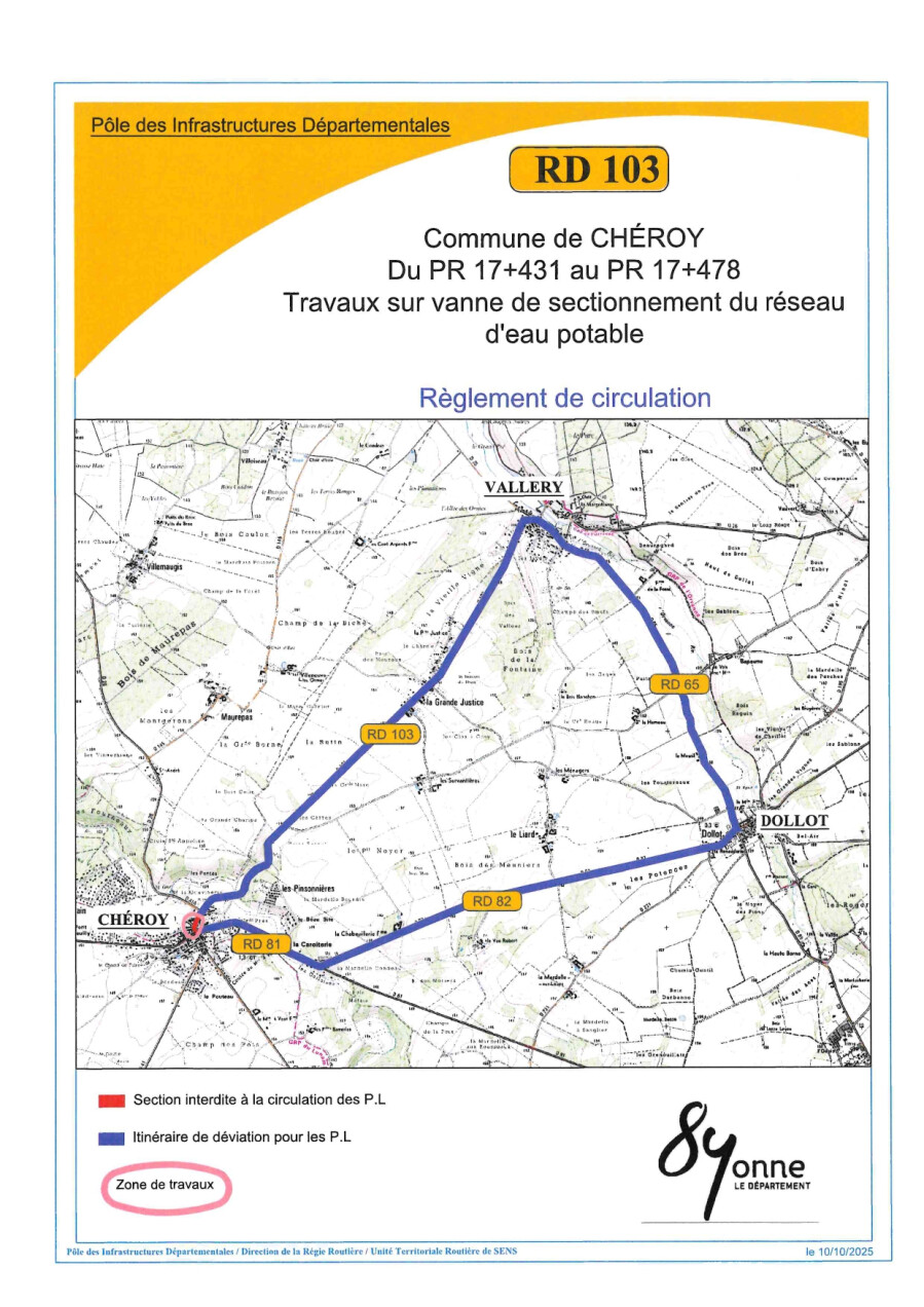 La circulation des véhicules sera interdite sur la RD 103 : du 01 au 19 septembre 2025, et du 13 octobre au 07 novembre 2025. Ces dates sont susceptibles d’évoluer si les conditions météorologiques le nécessitent.