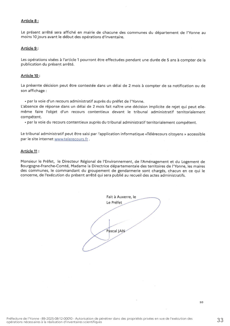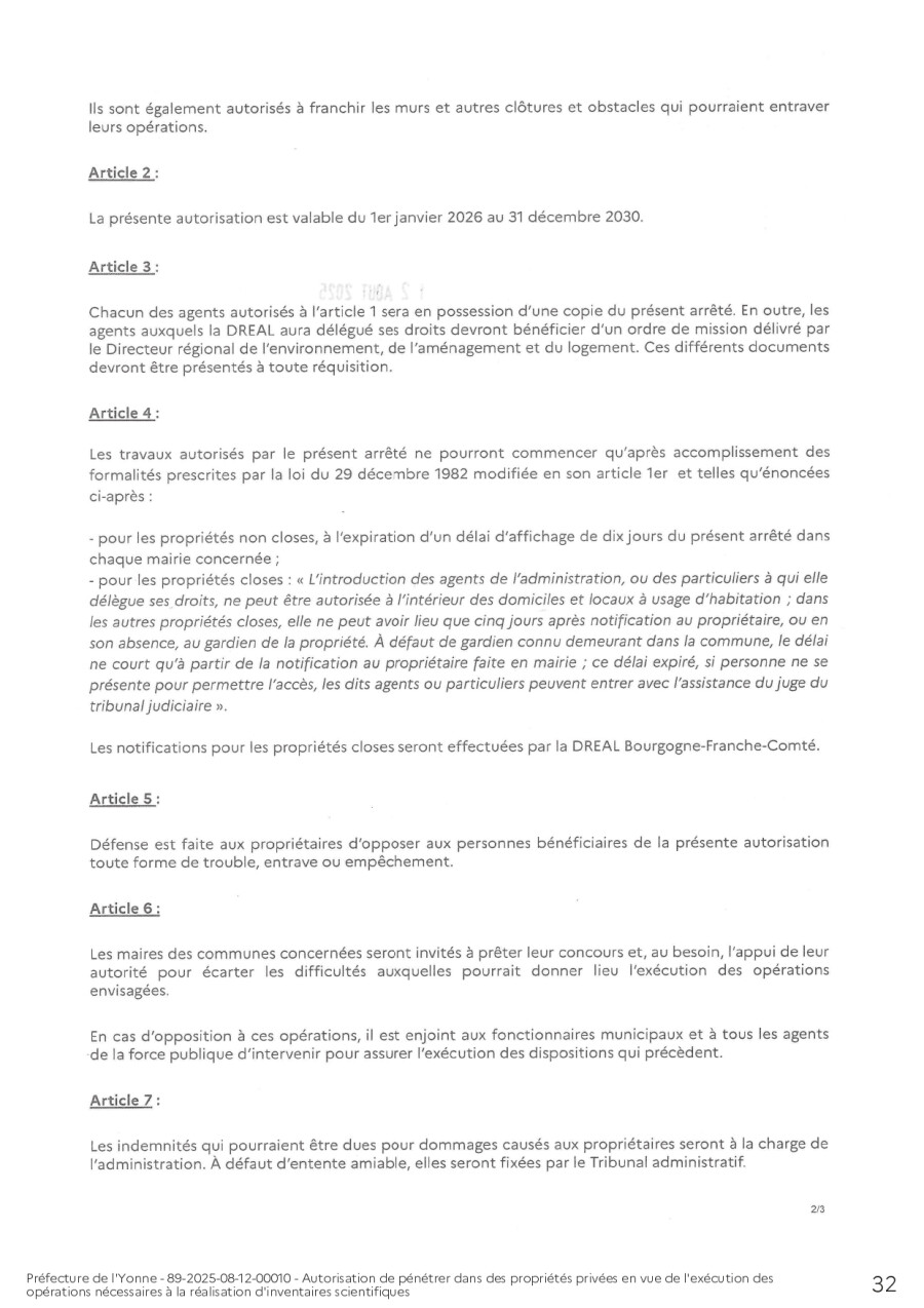 En application de ces dispositions réglementaires et de la circulaire du 2 octobre 2007 concernant l’accès à la propriété privée en vue de la réalisation de ces inventaires, M. le Préfet de l’Yonne a signé un arrêté préfectoral en date du 12 août 2025, valable 5 ans, donnant autorisation aux personnels de la DREAL, ainsi qu’aux personnes des structures auxquelles elle délègue ses droits de pénétrer dans les propriétés privées pour mener à bien les études de connaissances naturalistes.