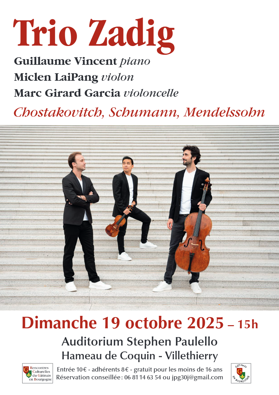 L'association Rencontres Culturelles du Gâtinais en Bourgogne - RCGB a le grand plaisir de vous annoncer que le Trio Zadig donnera le prochain concert qui aura lieu le dimanche 19 octobre à 15h au Studio Stephen Paulello à Coquin (Villethierry).