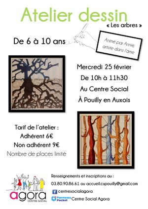🎨 ATELIER DESSIN : Le Centre Social propose un nouvel atelier dessin au 6-10 ans le mercredi 25 février de 10h à 11h30, sur le thème "des arbres". 🌳😉 Pas besoin d'être un Picasso pour venir participer, Annie va t'accompagner ! Inscription obligatoire auprès du Centre Social (règlement avant le jour de l'atelier pour finaliser l'inscription)