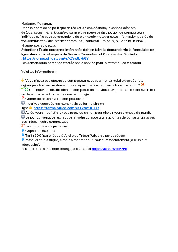 La Communauté de communes Coutances Mer et Bocage lance une deuxième campagne de mise à disposition de composteurs individuels pour réduire votre production de déchets organiques.