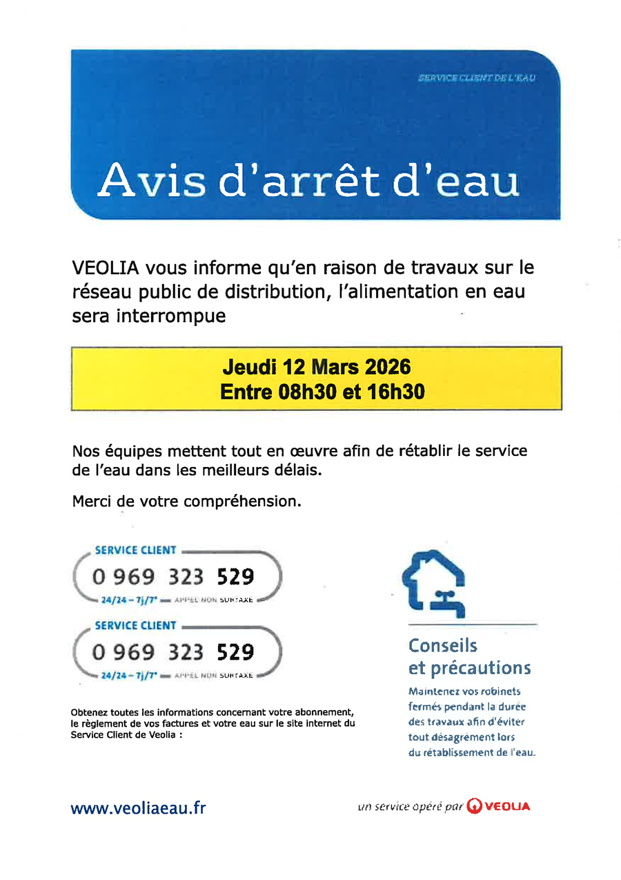 Pour information, l'alimentation en eau sera interrompue