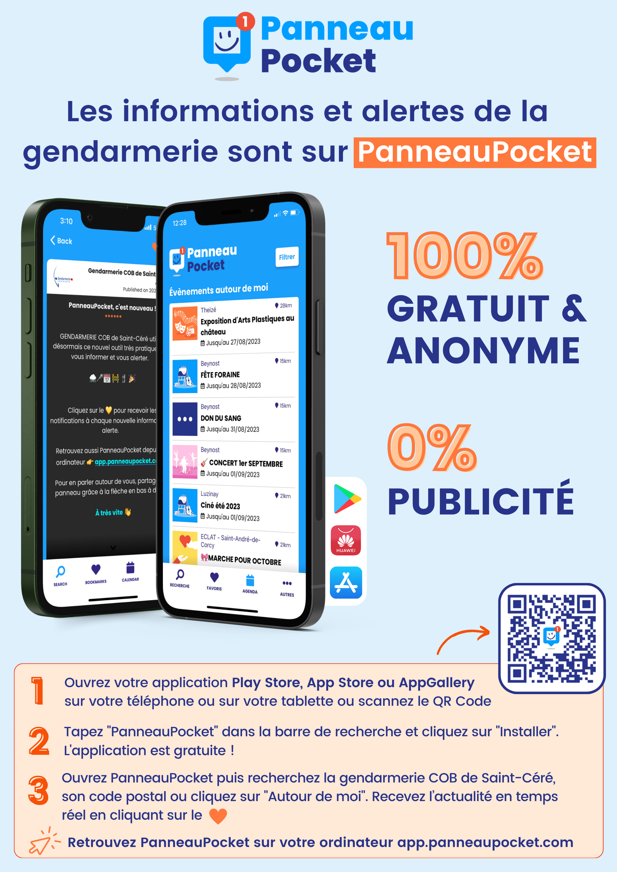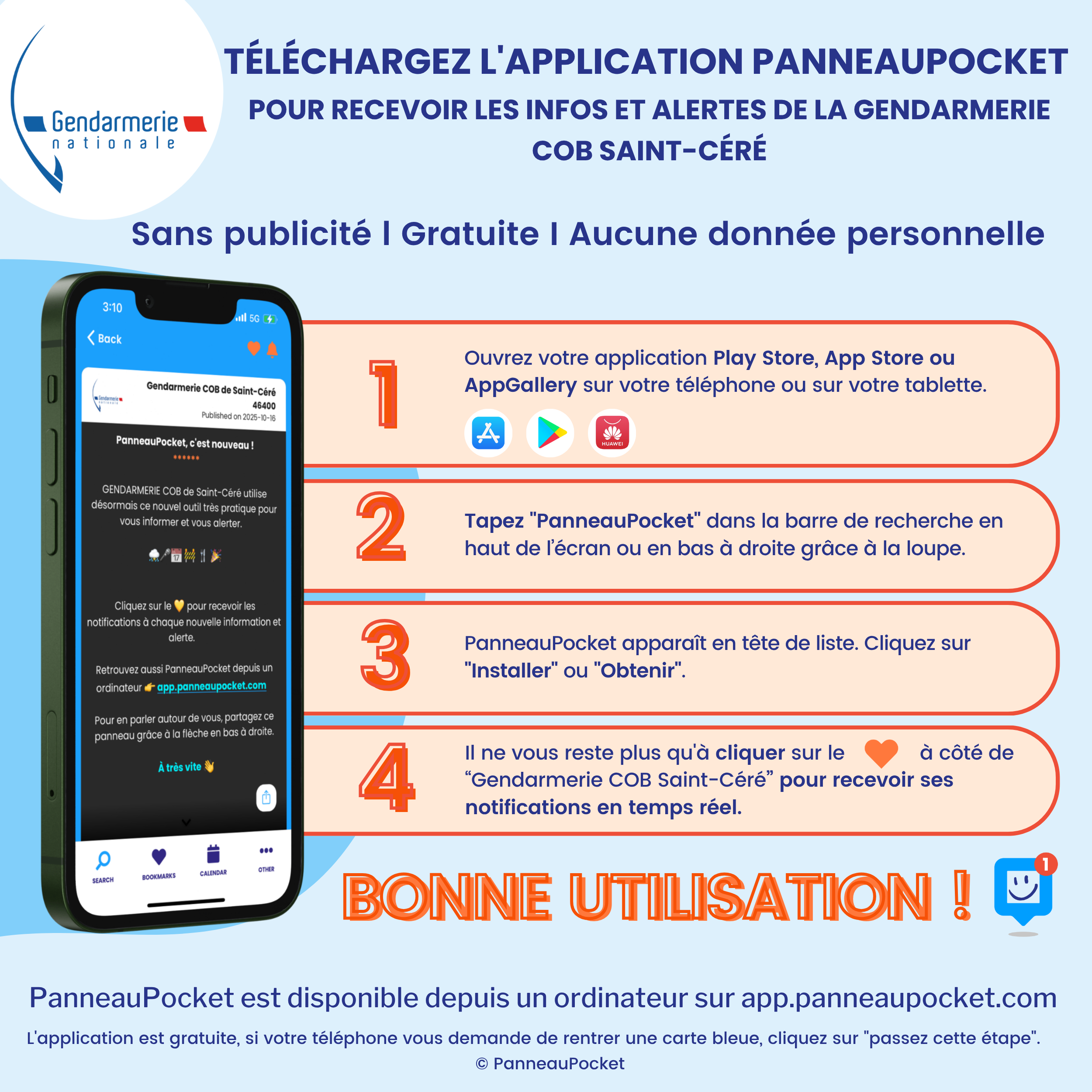 La commune est heureuse de mettre à disposition de ses habitants l’application PanneauPocket. Par cet outil très simple, elle souhaite tenir informés en temps réel les citoyens de son actualité au quotidien, et les alerter en cas de risques majeurs. Cette solution gratuite pour les habitants, sans récolte de données personnelles et sans publicité, permet d’établir un véritable lien privilégié entre le maire et ses citoyens.