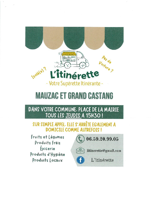 Retrouver l'épicerie l'itinérette à partir du 30 octobre et tous les jeudis sur la place de la poste de 15h30 à 16h30.