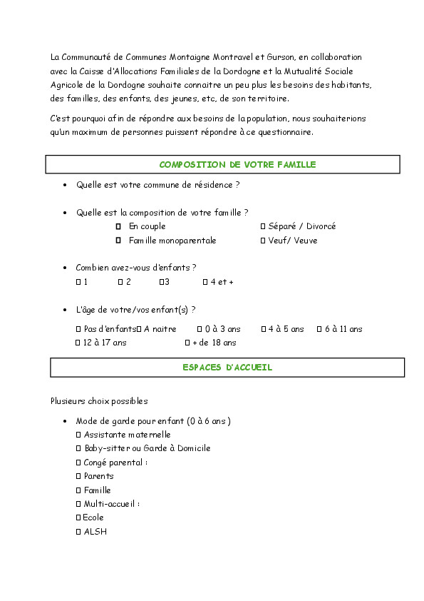 Dans le cadre du renouvellement de la convention avec la CAF de la Dordogne, la communauté de communes Montaigne Montravel et Gurson (CDC MMG) sollicite la population afin de connaître les besoins en petite enfance, enfance-jeunesse, parentalité et accès aux droits et aux services.