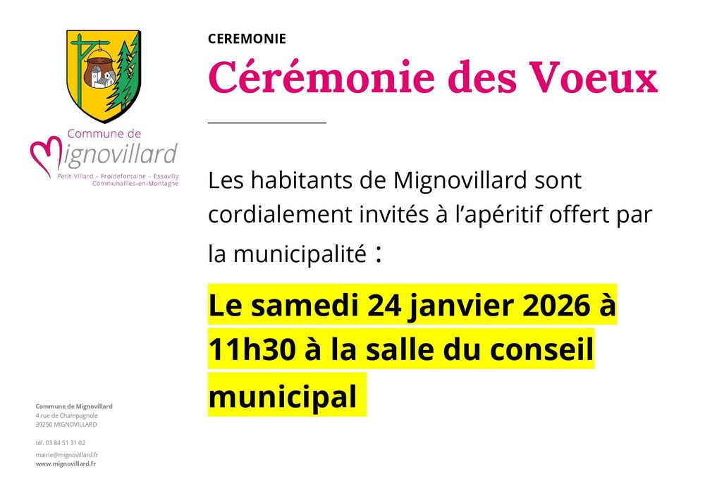 Monsieur le Maire et le Conseil municipal ont le plaisir de convier les habitantes et les habitants de Mignovillard à la cérémonie des Vœux du Maire.