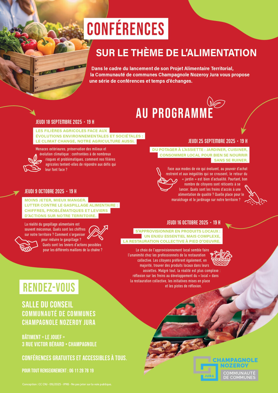 Dans le cadre du lancement de son Projet Alimentaire Territorial, la Communauté de communes Champagnole Nozeroy Jura organise une série de conférences gratuites et ouvertes à tous. Venez échanger et réfléchir autour de thématiques actuelles et essentielles :