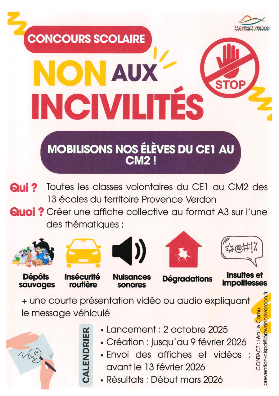 Dans le cadre du CISPD (Conseil Intercommunal de Sécurité et de Prévention de la Délinquance), et en partenariat avec l’Inspection de l’Éducation Nationale, la Communauté de communes Provence Verdon lance cette année un concours scolaire intitulé “Non aux incivilités”, à destination des classes du CE1 au CM2 des 13 écoles du territoire.