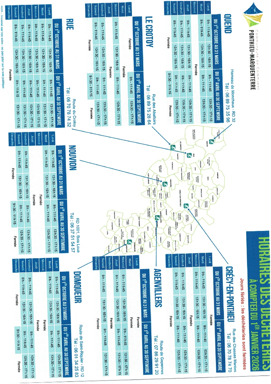 Pour rappel, veuillez trouver en pièce jointe le document comportant les horaires des déchetteries de la communauté de communes du ponthieu-marquenterre.