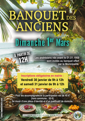 La Municipalité a le plaisir d’inviter les Andrésiennes et Andrésiens nés avant le 1er janvier 1959 au traditionnel Banquet des Anciens, qui se tiendra le