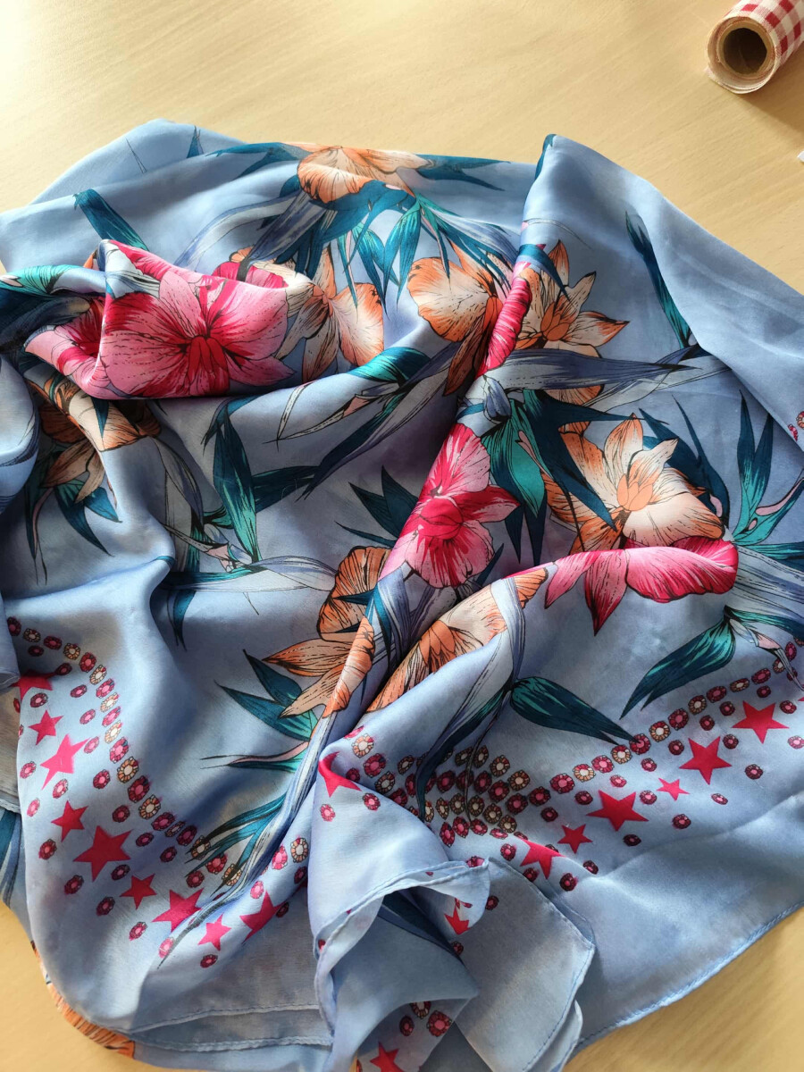 Un joli foulard de coloris bleu à fleurs attend sa propriétaire en mairie.