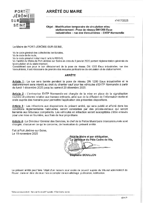 Les travaux de la conduite d'eau industrielle entre les réservoirs et la Porte St Georges impacteront la Rue des Varouillères à partir du lundi 1er décembre, pour une durée probable de 15 jours.