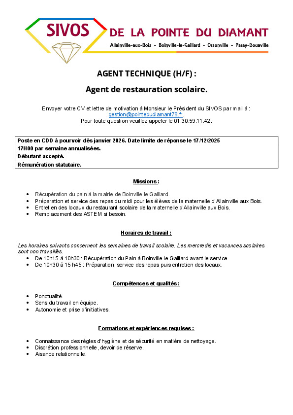 Merci d'adresser votre CV et lettre de motivation Ă : gestion@pointedudiamant78.fr
