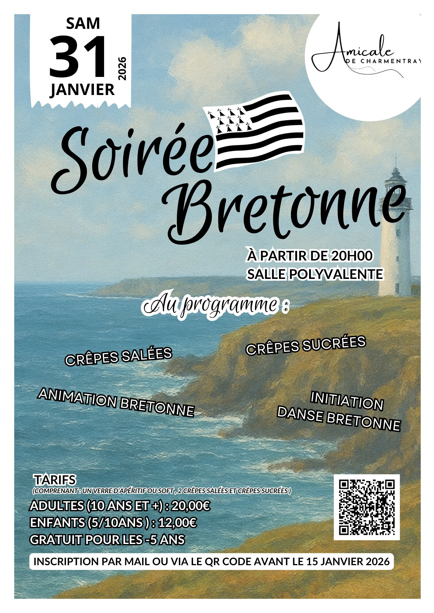 INSCRIPTION AVANT LE 15 JANVIER 2026 via le lien suivant : https://www.helloasso.com/associations/l-amicale-de-charmentray/evenements/soiree-bretonne?_gl=1%2a10vyf3u%2a_gcl_au%2aMTg3NTczMTQ4OS4xNzY2Njg5MzQ2LjE4MjIxMjUyOTUuMTc2NjY5MjExMS4xNzY2NjkyMTEw