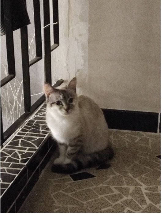 Thalia est timide mais gentille, de couleur blanche avec les pattes, la tête et la queue grises.