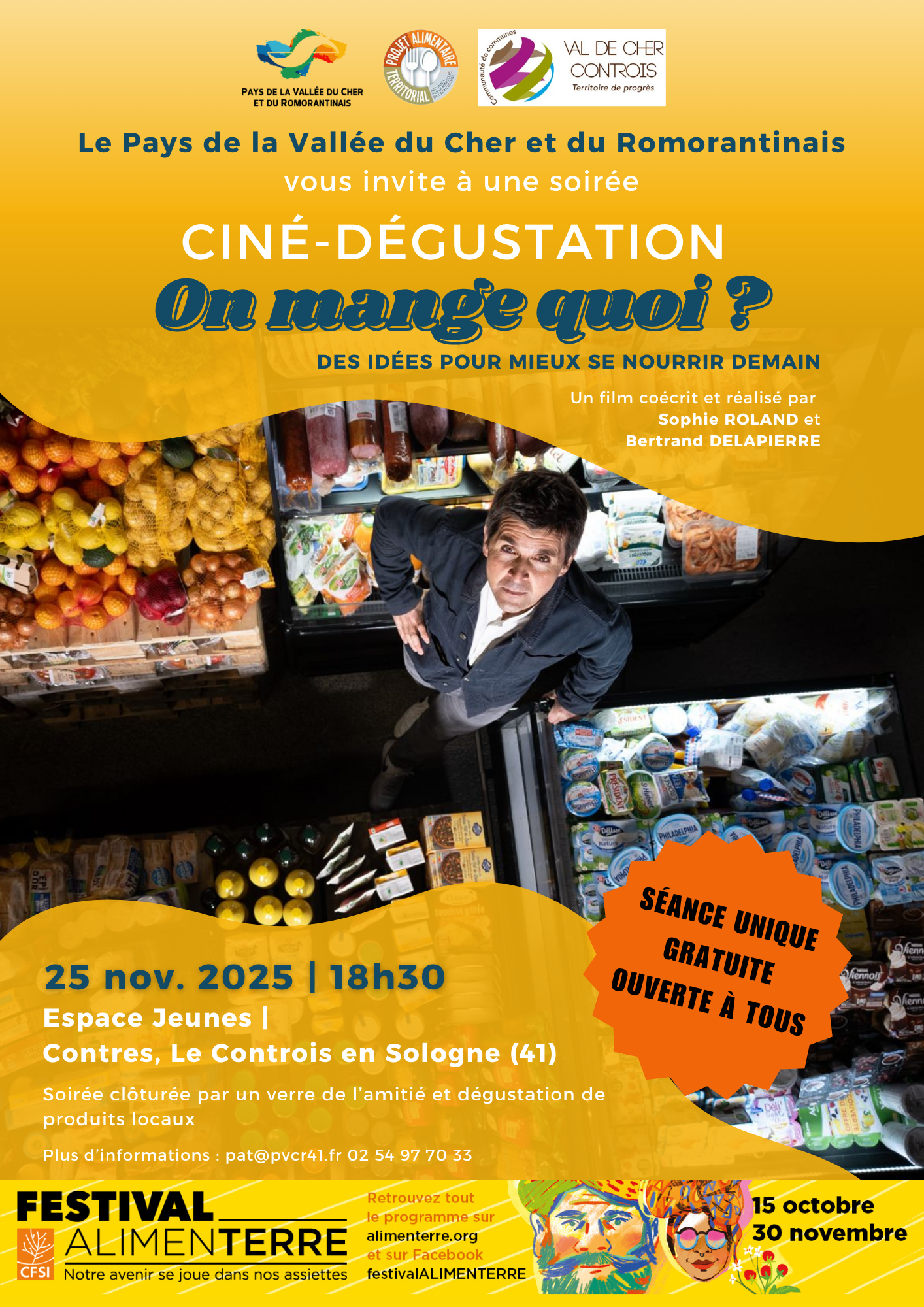 Dans le cadre de son Projet Alimentaire de Territoire, le Pays de la Vallée du Cher et du Romorantinais vous propose l’animation de soirées ciné-dégustation gratuites et ouvertes à tous à l’occasion du Festival AlimenTERRE pour une agriculture et une alimentation plus durable.