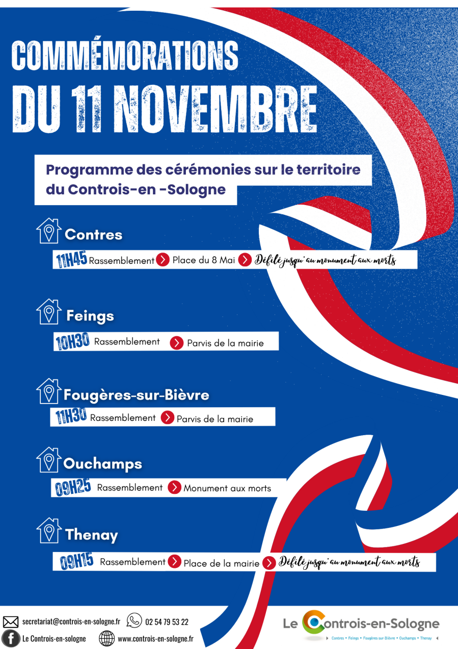 Les cérémonies de commémoration de l’Armistice de la Grande Guerre se tiendront mardi 11 novembre 2025 dans les communes déléguées du Controis-en-Sologne.