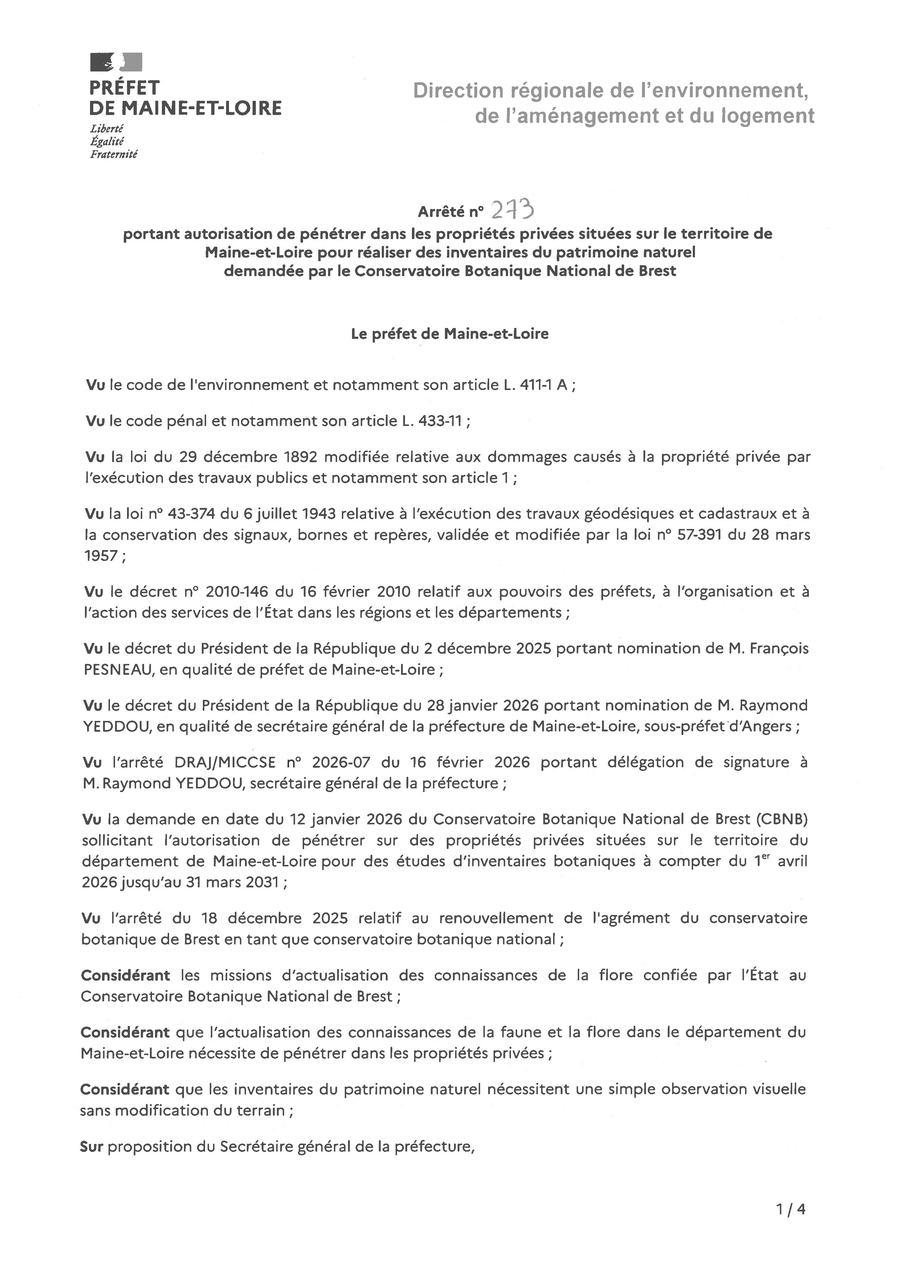 autorise les agents du Conservatoire Botanique National de Brest, agissant pour le compte de l'Etat, à accéder aux propriétés publiques et privées (hors habitations) afin d'y faire des inventaires du patrimoine naturel, entre le 1er avril 2026 et le 31 mars 2031.
