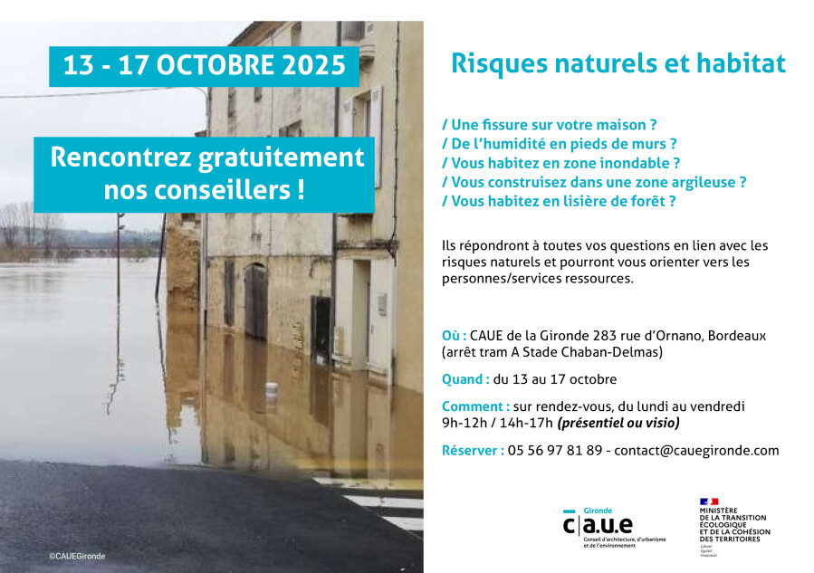 Je vous relaye les actions proposées par le CAUE concernant des permanences exceptionnelles pour les particuliers dédiées aux risques naturels. Ces permanences sur la semaine du 13 au 17 octobre peuvent être réalisées par visioconférence.