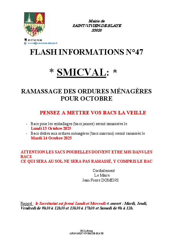 Un Flash info est distribué dans vos boites aux lettres - en plus de l'information sur Panneau Pocket - lorsque nous avons des informations concernant le SMICVAL et le ramassage des poubelles !!