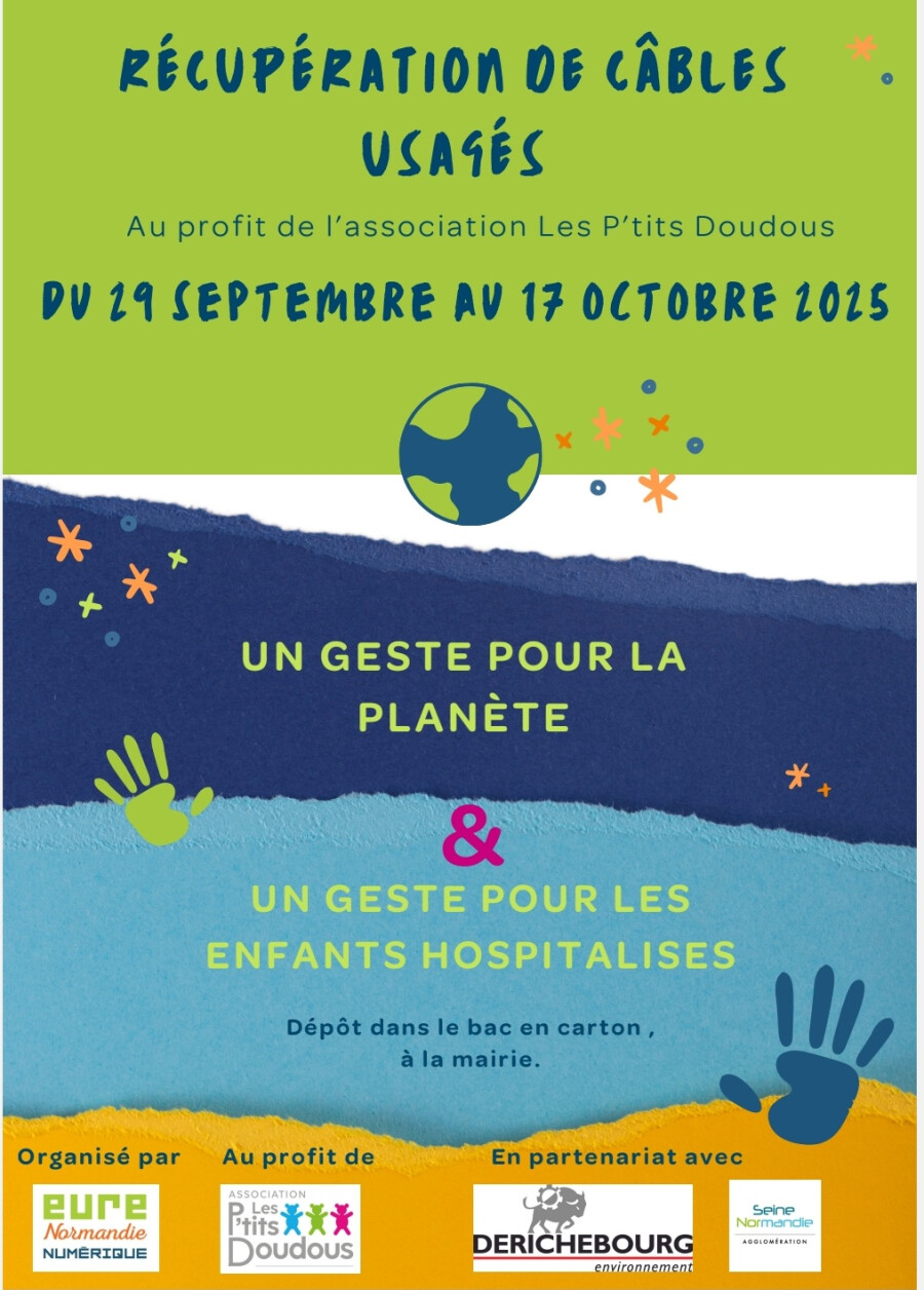 📥 L'association Les P'tits Doudous, en lien avec Eure Normandie Numérique, SNA et avec la commune, met à votre disposition jusqu'au 17 octobre, une boîte en carton pour récupérer vos câbles usagers.